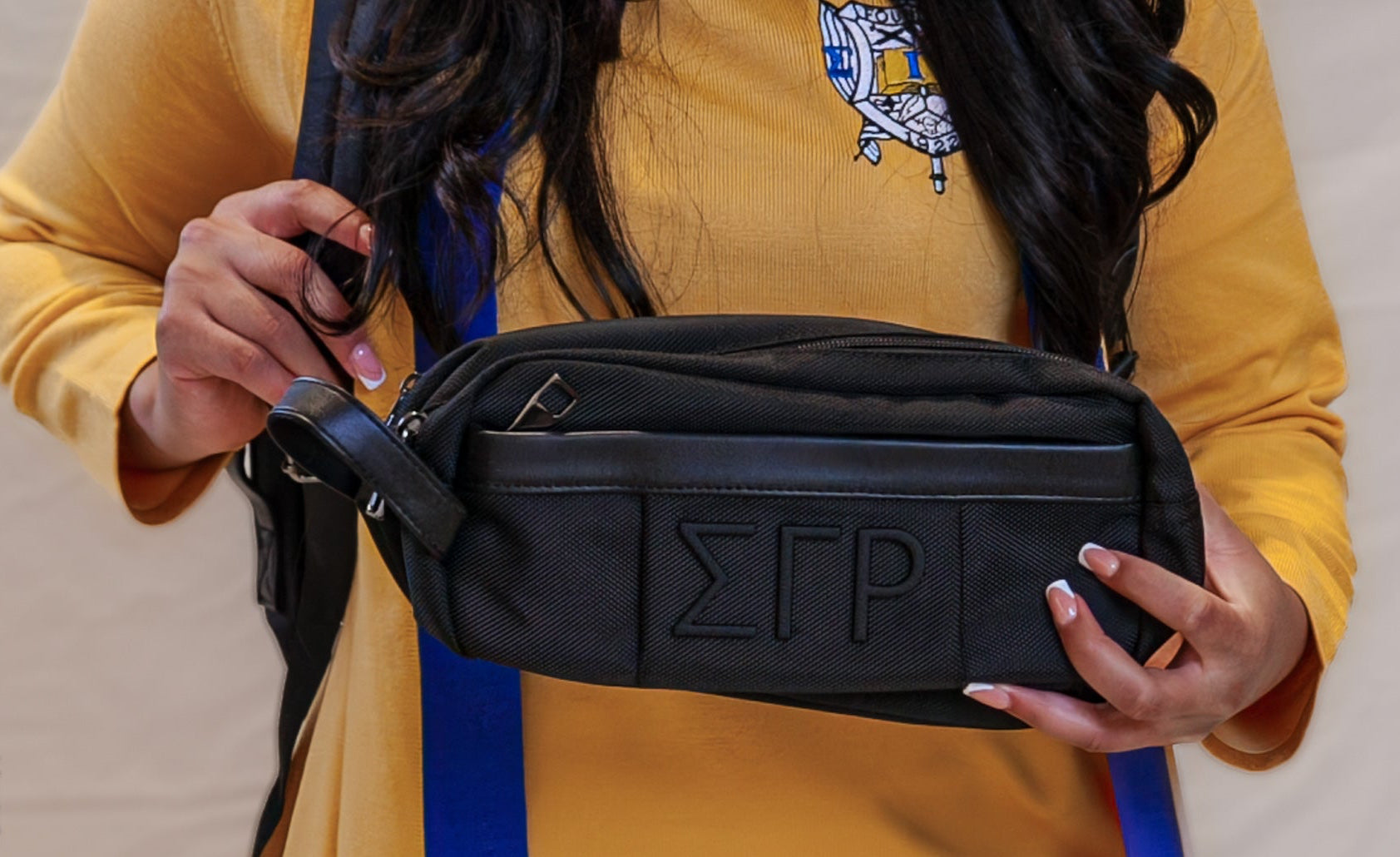 Elevate your style with the Prestige Collection Backpack and Pouch Set. This sleek, black-on-black set features the iconic ΣΓΡ greek letters and combines elegance with practicality. The backpack boasts a minimalist design with a smooth, durable vegan leather top and a textured, high-quality fabric body. Multiple compartments provide ample space for your essentials, including books, a laptop, and smaller items, while adjustable padded shoulder straps ensure maximum comfort for daily use.