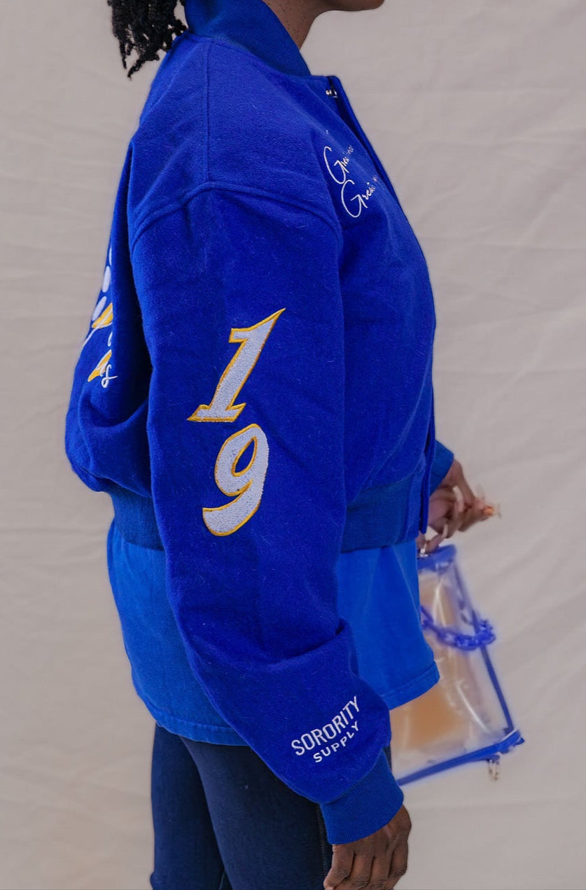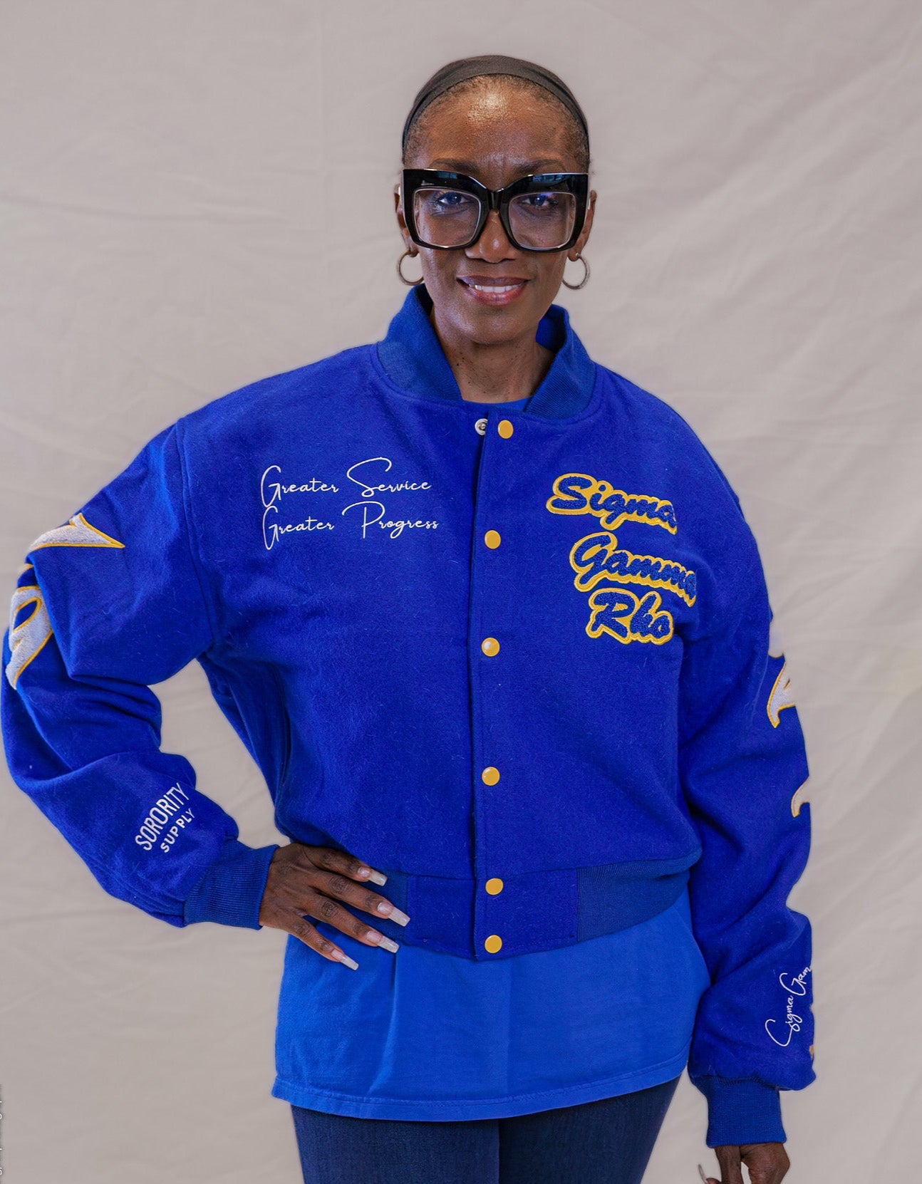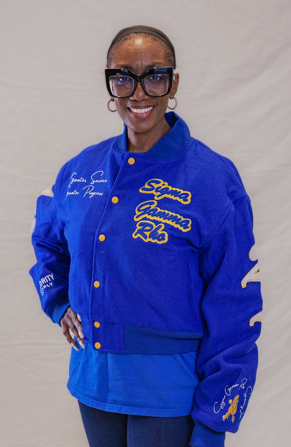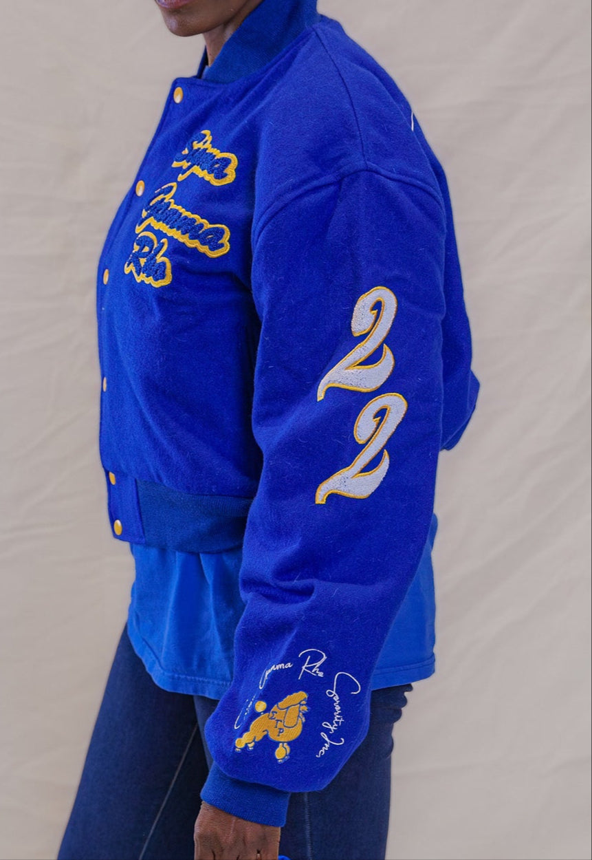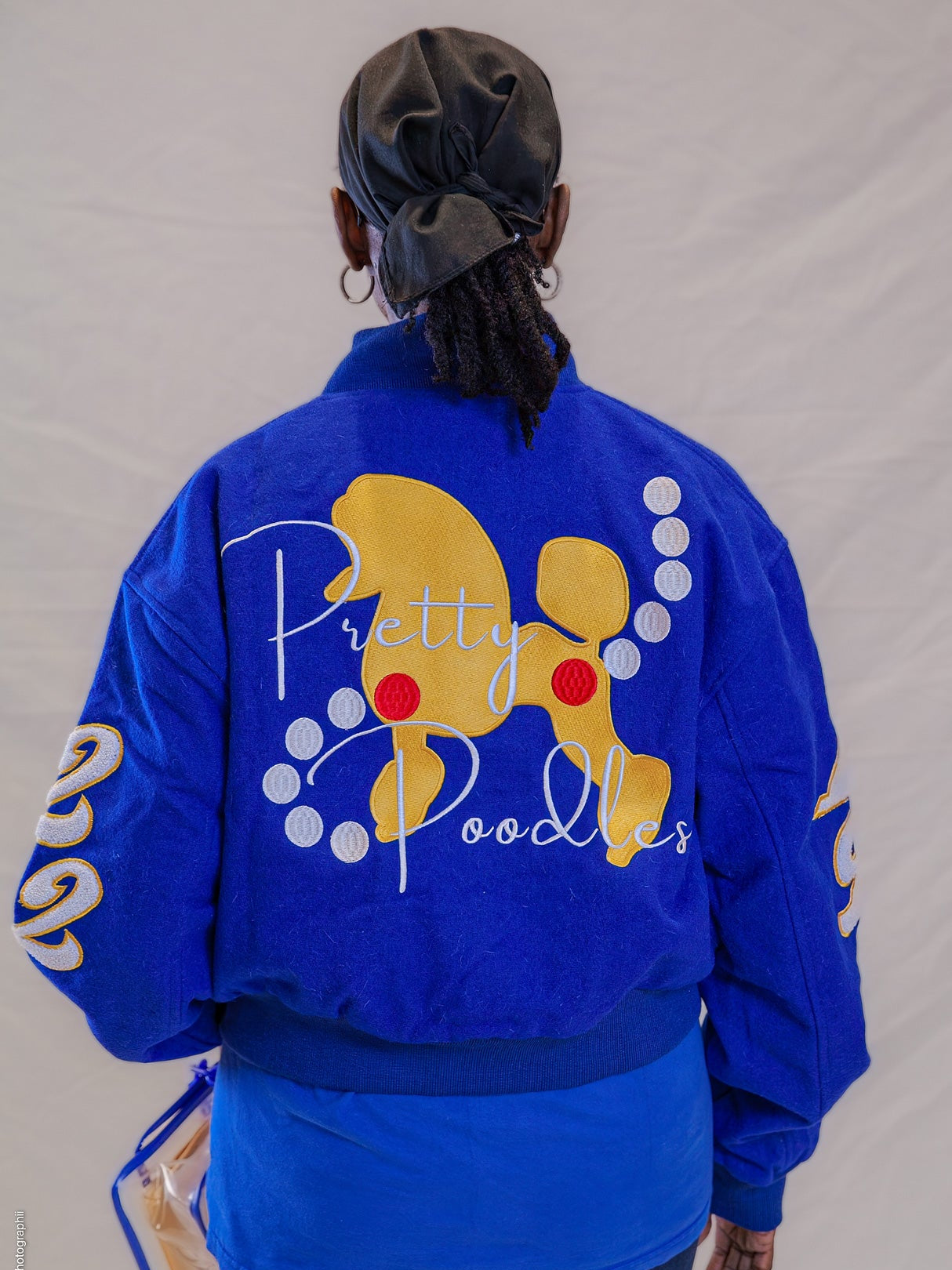 Elevate your sorority wardrobe with the Pretty Poodle Varsity Jacket, a perfect blend of classic style and sorority pride. This mid-weight jacket is designed for moderate temperatures and waist-length comfort, making it a versatile addition to your collection. Crafted from a combination of premium leather and wool, the jacket features a full-snap front for easy wear. The classic varsity neckline adds a timeless touch, while the two front pockets provide practicality and style. Adorned with embroidery and chenille patches, the Pretty Poodle Varsity Jacket proudly showcases Sigma Gamma Rho's legacy. The design includes prominent "1922" on the sleeves, "Sigma Gamma Rho" on the chest, and "Greater Service, Greater Progress" on the right chest, celebrating the sorority's rich history and values.