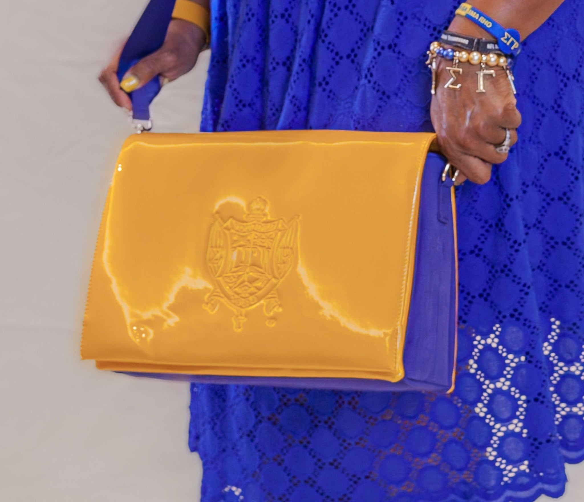 The Simone Crossbody, a chic and stylish accessory designed for Sigma Gamma Rho members who appreciate elegance and functionality. Crafted from vibrant yellow patent vegan leather, this crossbody bag is both eco-friendly and eye-catching. The luxurious blue suede material on the sides and bottom adds a sophisticated contrast, enhancing the overall design. The adjustable crossbody strap, embossed with the shield not only provides hands-free convenience but also showcases your sorority pride with every wear. Perfect for carrying your essentials, the Simone Crossbody combines bold colours, luxurious materials, and sorority pride in one stunning bag. Note: Crossbody straps will be royal blue.